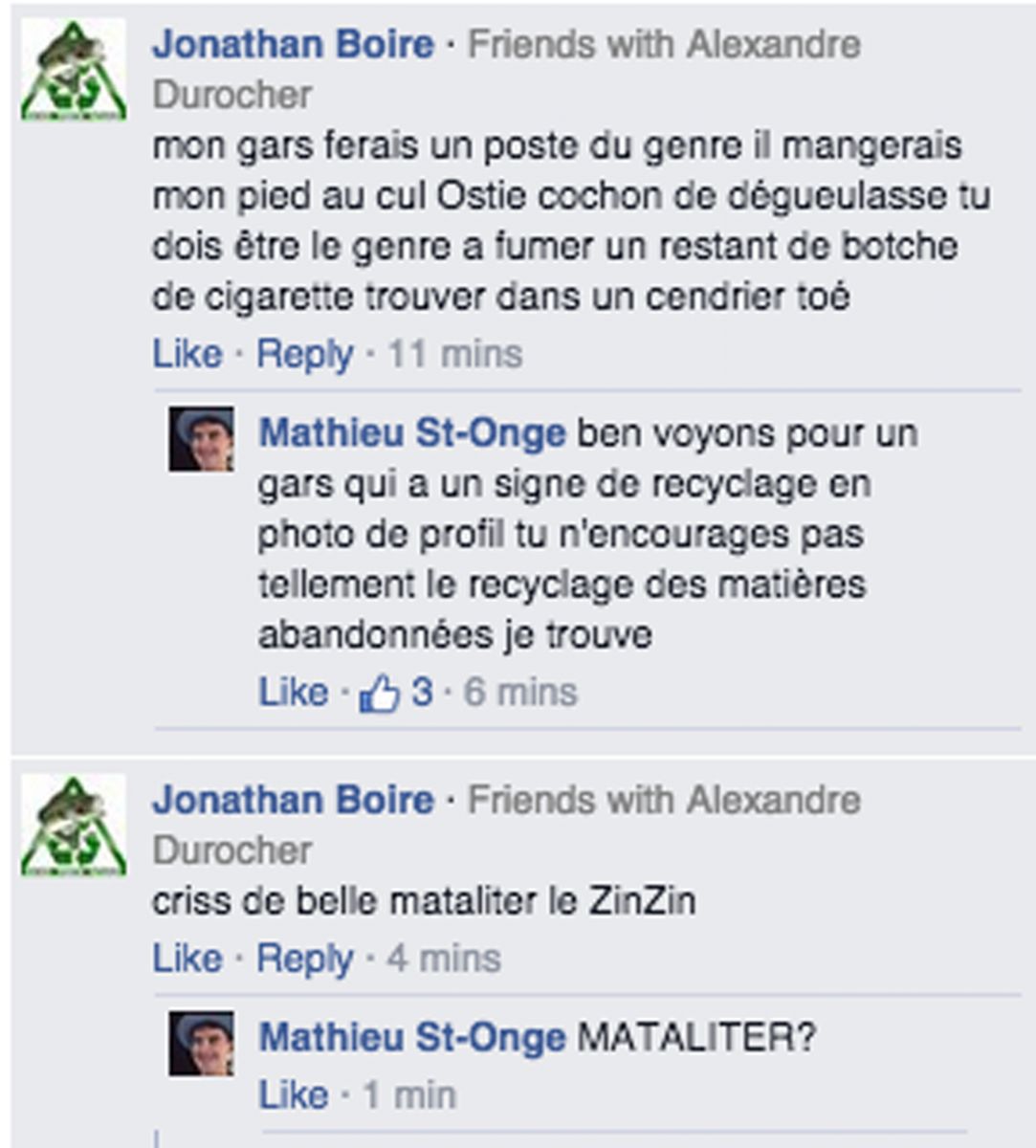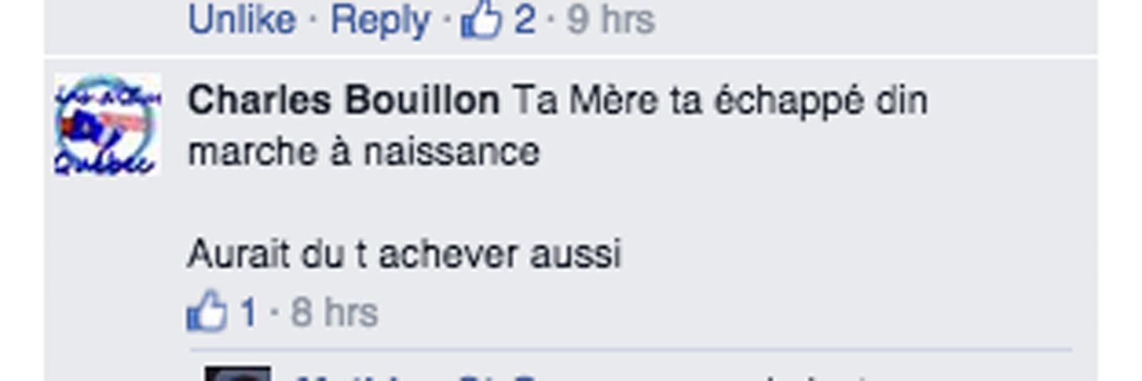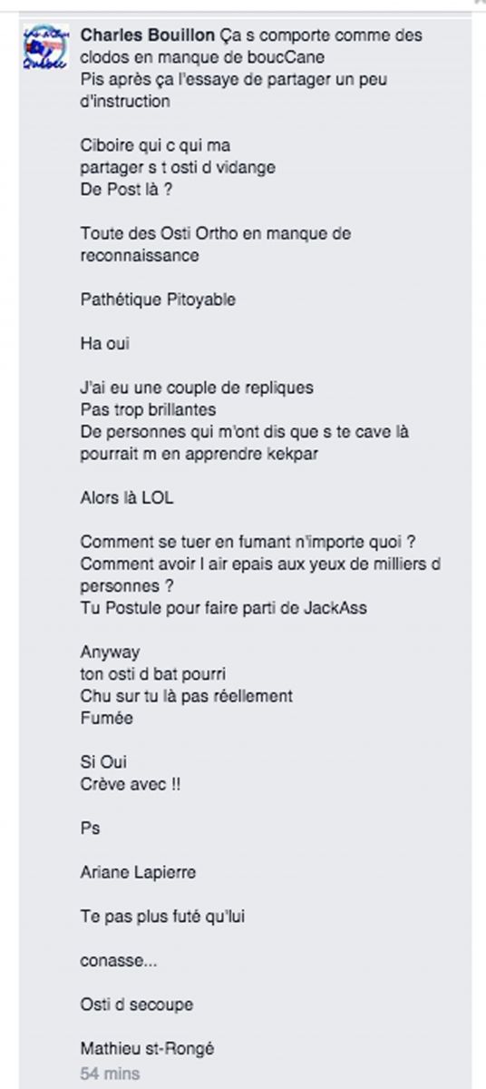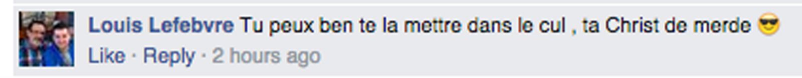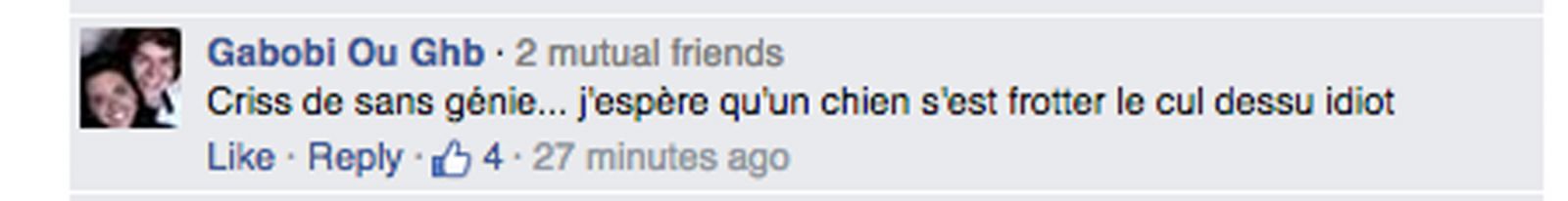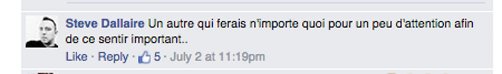 L'attrait pour ce spectacle destructeur est bien réel. Les commentaires sont devenus de plus en plus aggressifs. Sur facebook, il est possible depuis peu de répondre à un commentaire directement sur un fil de discussion. Cette fonction n'était pas maîtrisé par quelques utilisateurs qui ont commenté ici. Une madame très choquée voulait donc répondre à un de mes sous-commentaire, mais elle a commenté la publication en soi, alors son commentaire n'es pas atterri à la bonne place. Quelqu'un lui a fait remarqué avec mépris, et elle l'a tout de suite effacé. Quelle dommage que je n'aie pas eu le temps de le prendre en capture d'écran. J'y ai pensé toute la journée avec regret, comme si on avait jeté dans mon dos un item gardagé. Elle disait vouloir me frapper avec un balai si j'étais à 6 pouces de son visage. Voici un autre commentaire de sa part, toujours impliquant un balai.