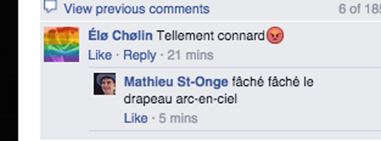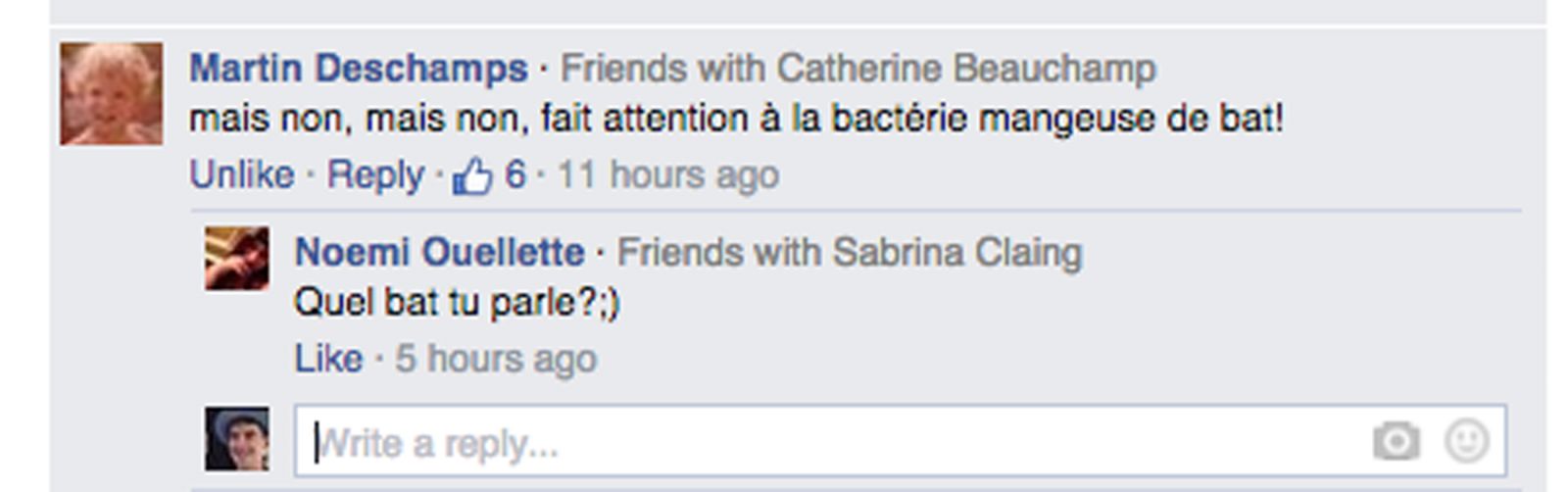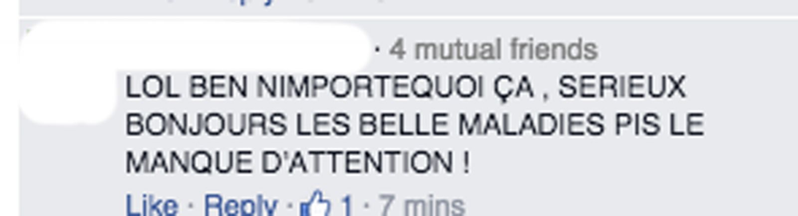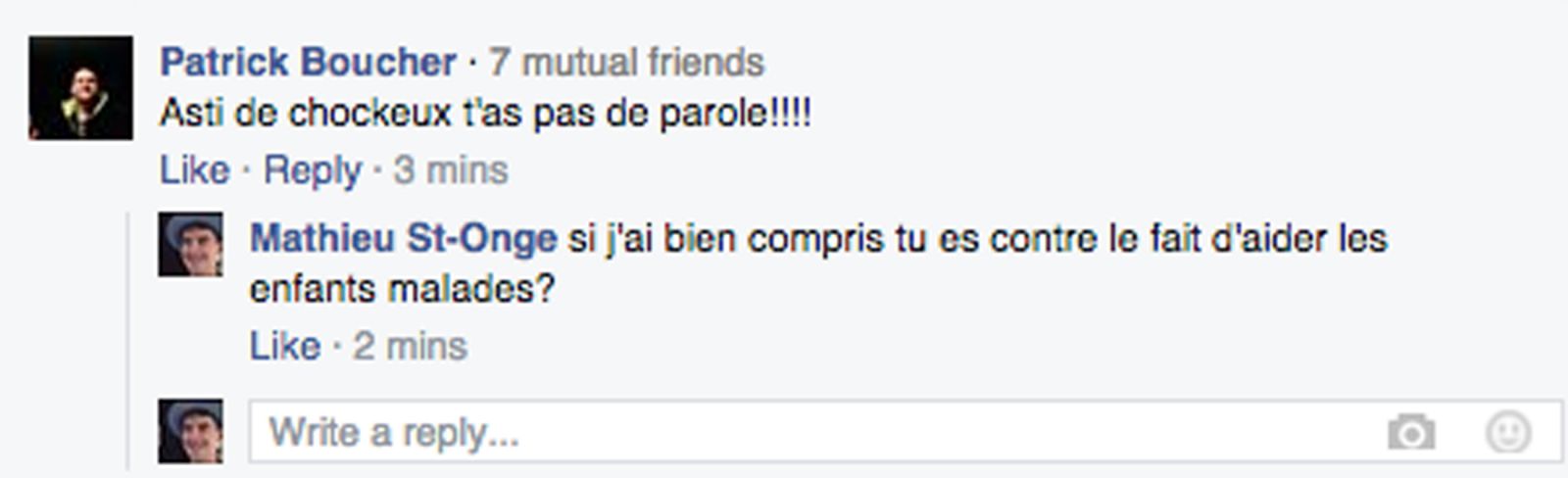 L'attrait pour ce spectacle destructeur est bien réel. Les commentaires sont devenus de plus en plus aggressifs. Sur facebook, il est possible depuis peu de répondre à un commentaire directement sur un fil de discussion. Cette fonction n'était pas maîtrisé par quelques utilisateurs qui ont commenté ici. Une madame très choquée voulait donc répondre à un de mes sous-commentaire, mais elle a commenté la publication en soi, alors son commentaire n'es pas atterri à la bonne place. Quelqu'un lui a fait remarqué avec mépris, et elle l'a tout de suite effacé. Quelle dommage que je n'aie pas eu le temps de le prendre en capture d'écran. J'y ai pensé toute la journée avec regret, comme si on avait jeté dans mon dos un item gardagé. Elle disait vouloir me frapper avec un balai si j'étais à 6 pouces de son visage. Voici un autre commentaire de sa part, toujours impliquant un balai.