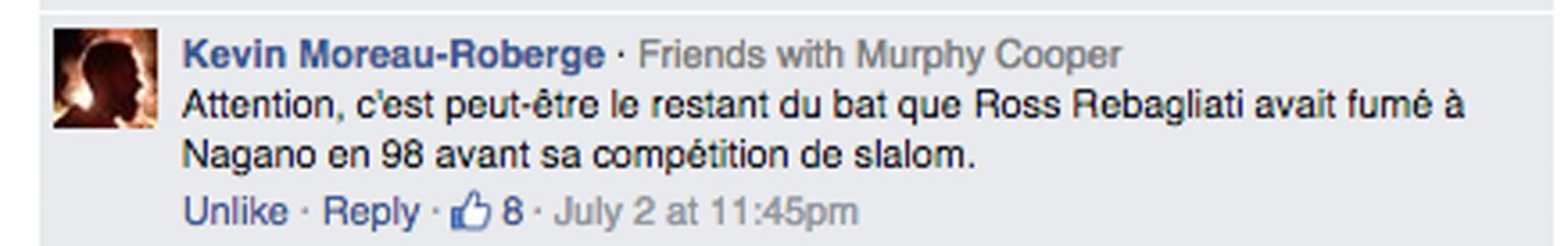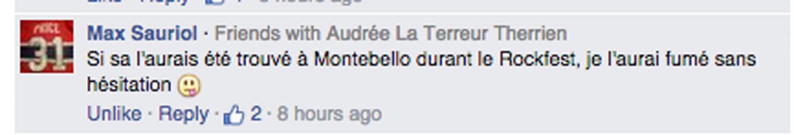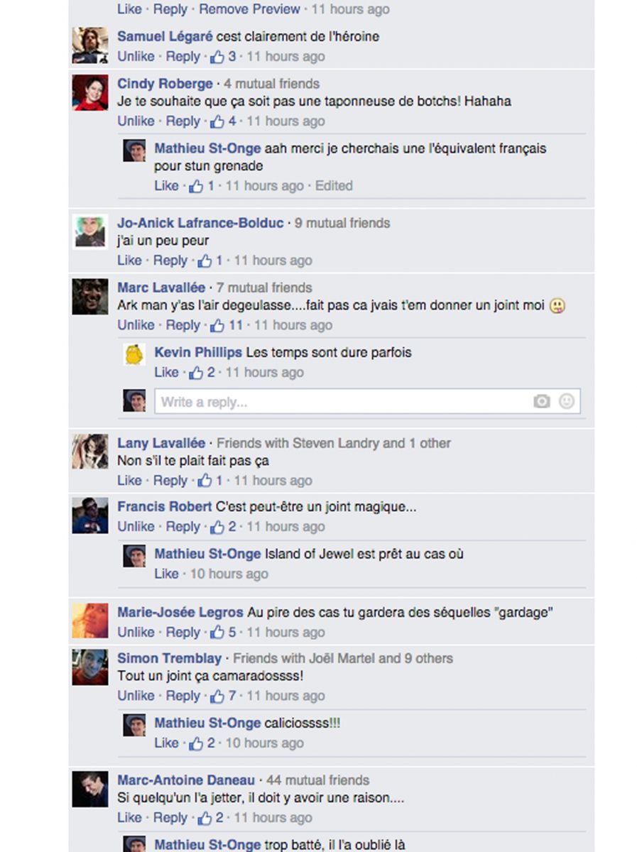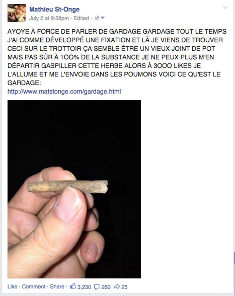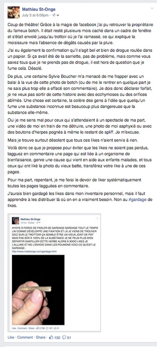 J'ai trouvé en faisant du ménage dans le sous-sol de mon nouvel appartement un vieux mégot de ce qui semblait être une rouleuse. Je l'ai conservé en vue d'en faire une publication où je feindrais une incapacité de jeter quoi que ce soit à cause de mon obsession pour le gardage. Majuscules enfoncées, syntaxe douteuse, défi dégradant, quêtage désespéré de likes: j'ai rassemblé une série d'éléments clés pour faire rager les utilisateurs facebook et atteindre l'objectifs de likes, que j'avais fixé à 2000 au départ, mais c'était sous-estimer le goût des gens pour les spectacles jack-ass.